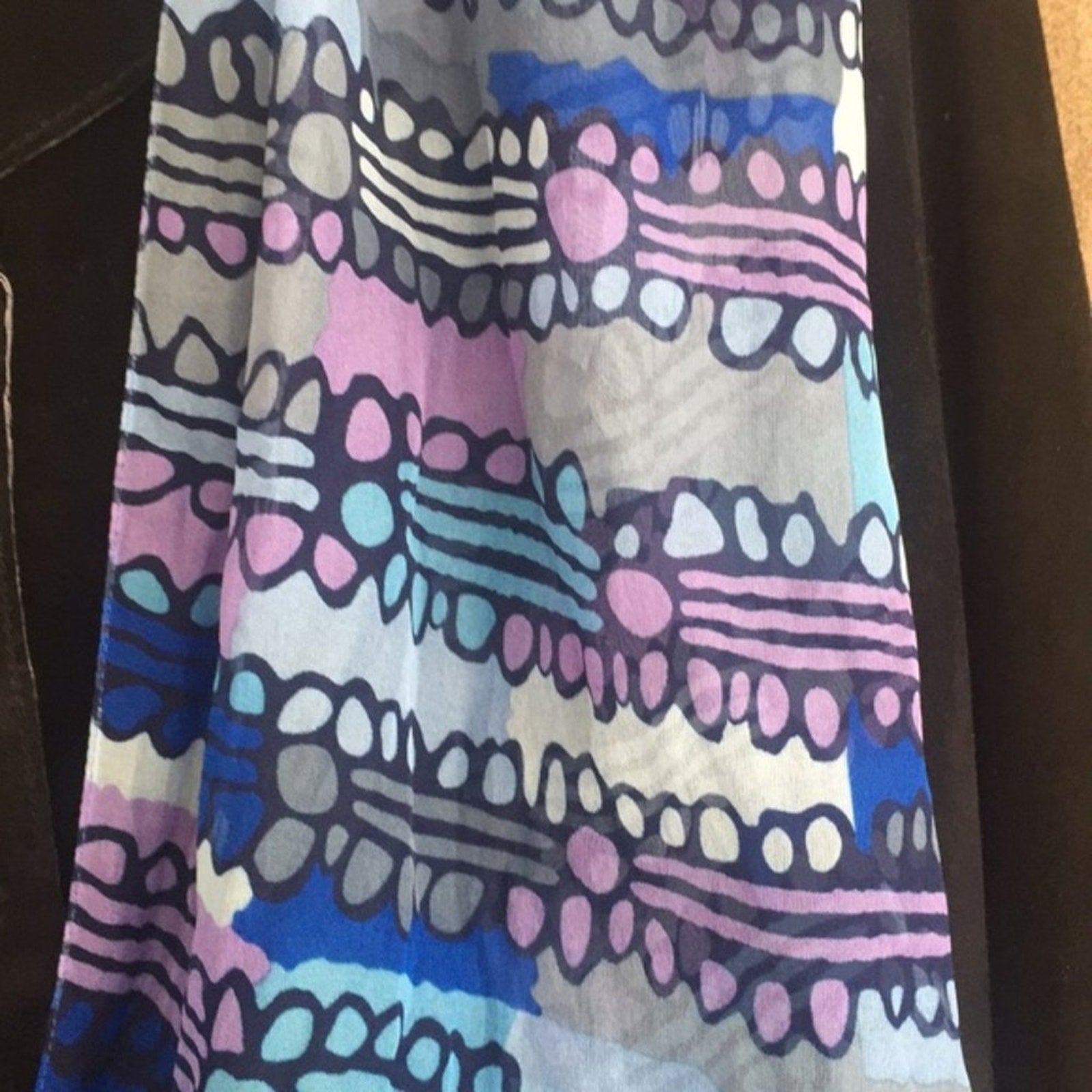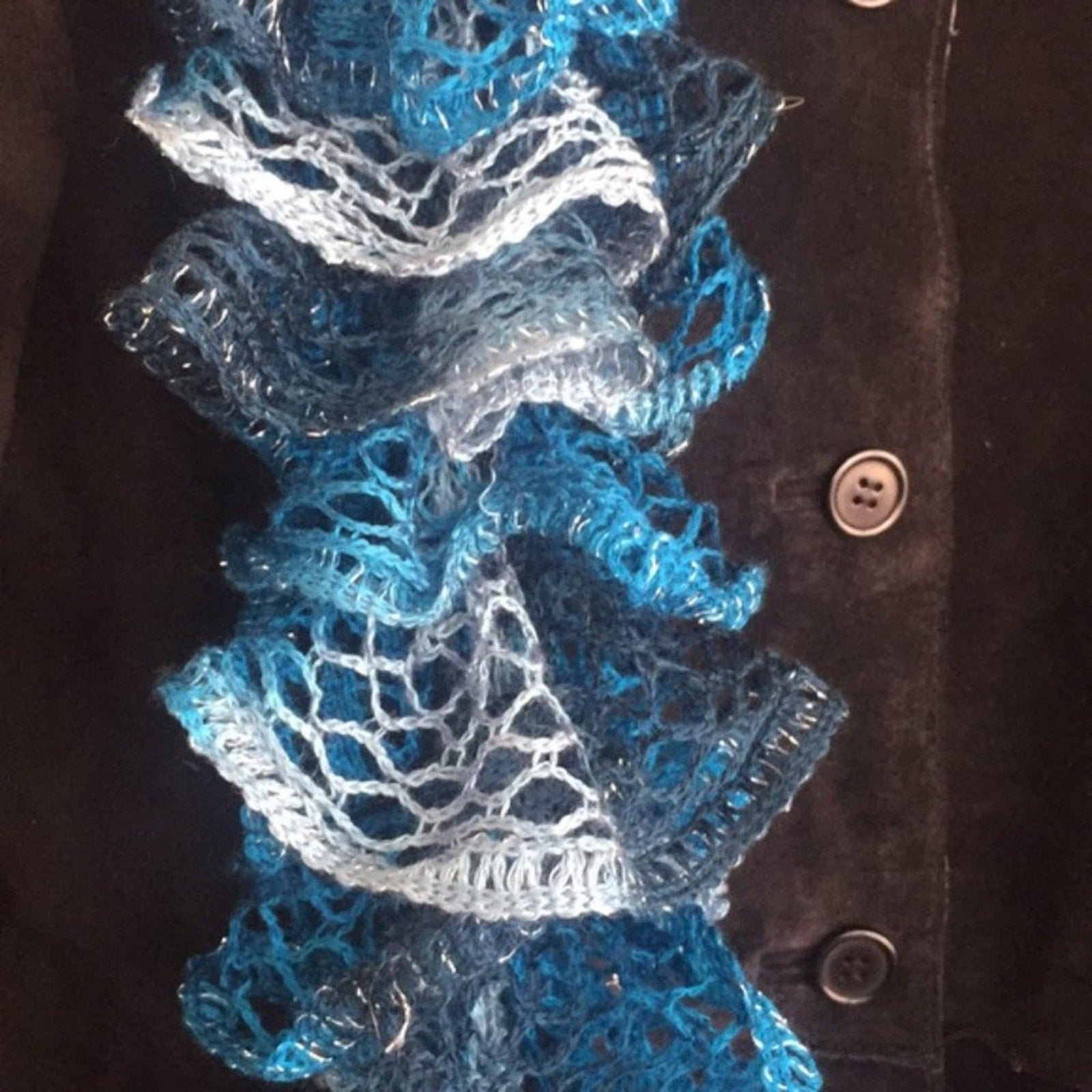The patterned silk scarf is from Australia and measures approximately 16 inches wide by 50 inches long. The green and white warm infinity scarf is approx 22 inches wide and 32 inches long. I knitted the third scarf which measures approximately 60 inches long by 4 inches wide.