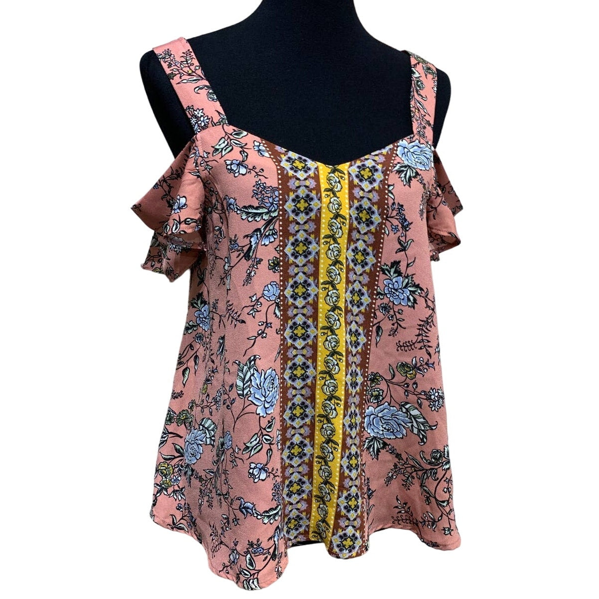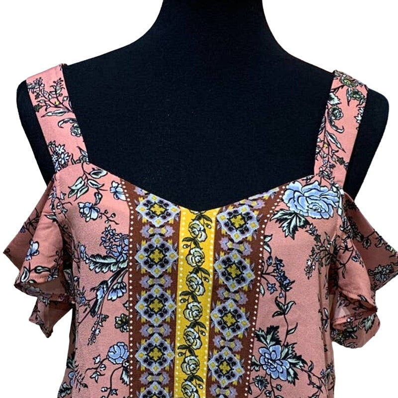 Aine Be Womens Medium Ruffled Cold Shoulder Floral Boho Polyester Blouse Top