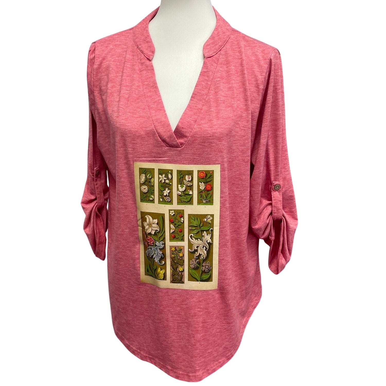 Hand Printed Upcycled XL Vintage Book Page Flower Butterfly Tabbed Sleeve Top