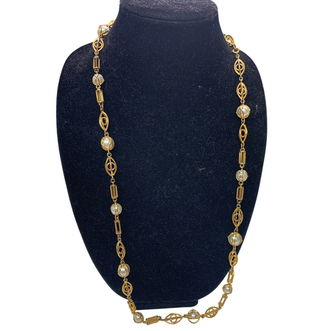 Vintage 33" Faux Pearl Art Deco Long Gold Toned Chain Link Necklace