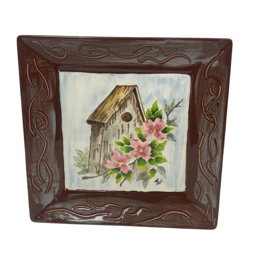 Vintage Painted Bird House Floral 10" Square Ceramic Serving Dish Plate Platter