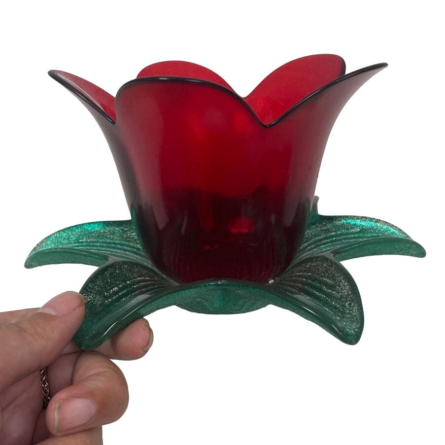 Vintage Vetreria LUX Made In Italy Red Glass Flower Glitter Leaf Candle Holder