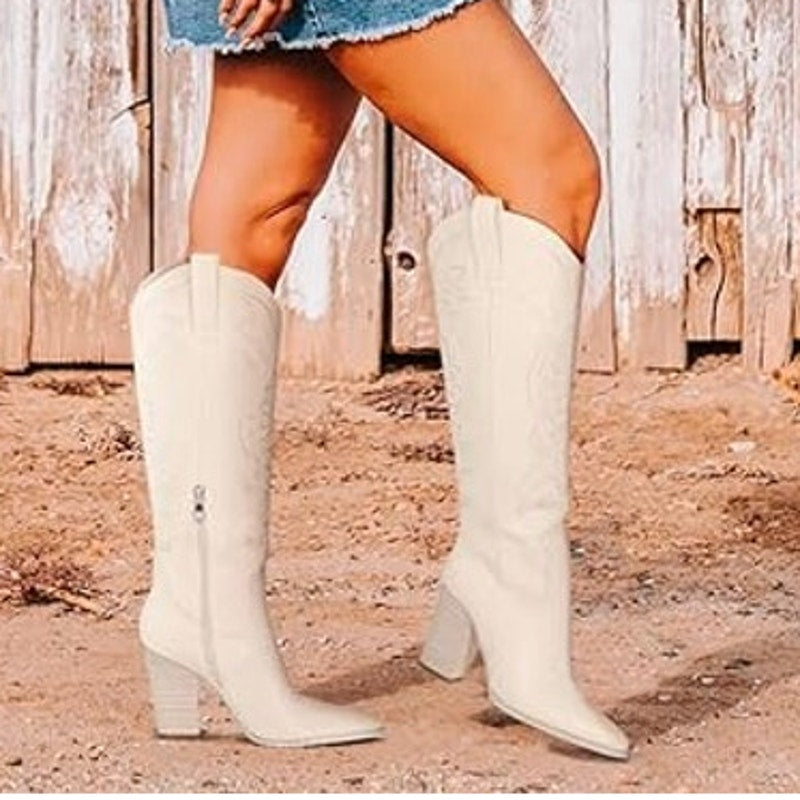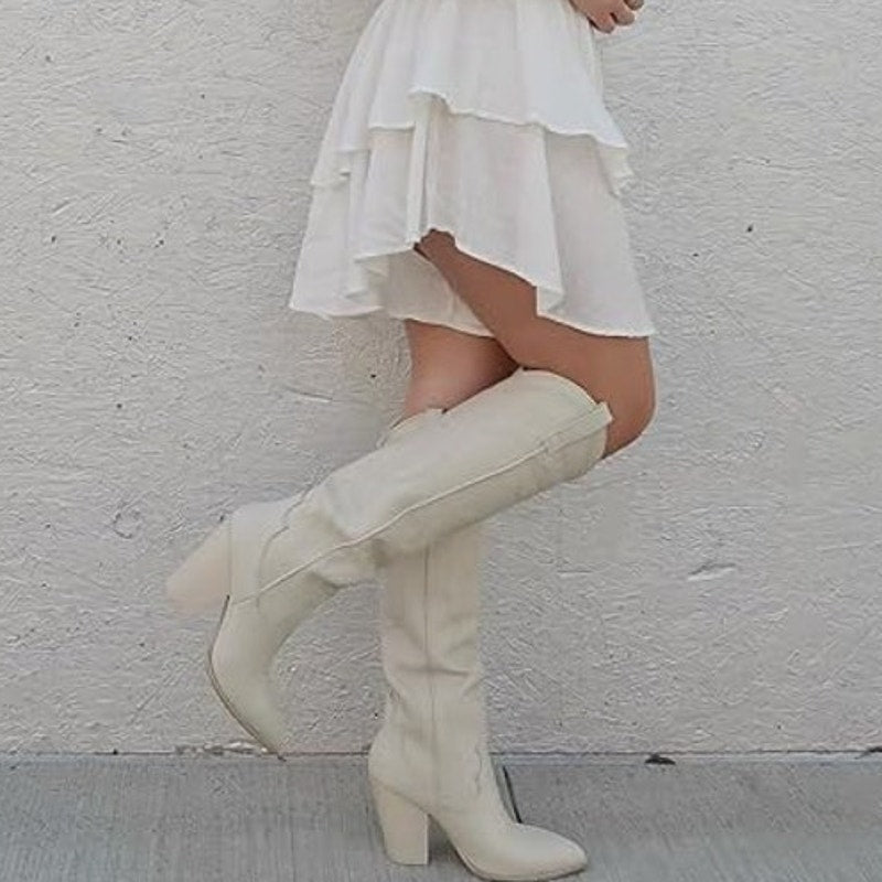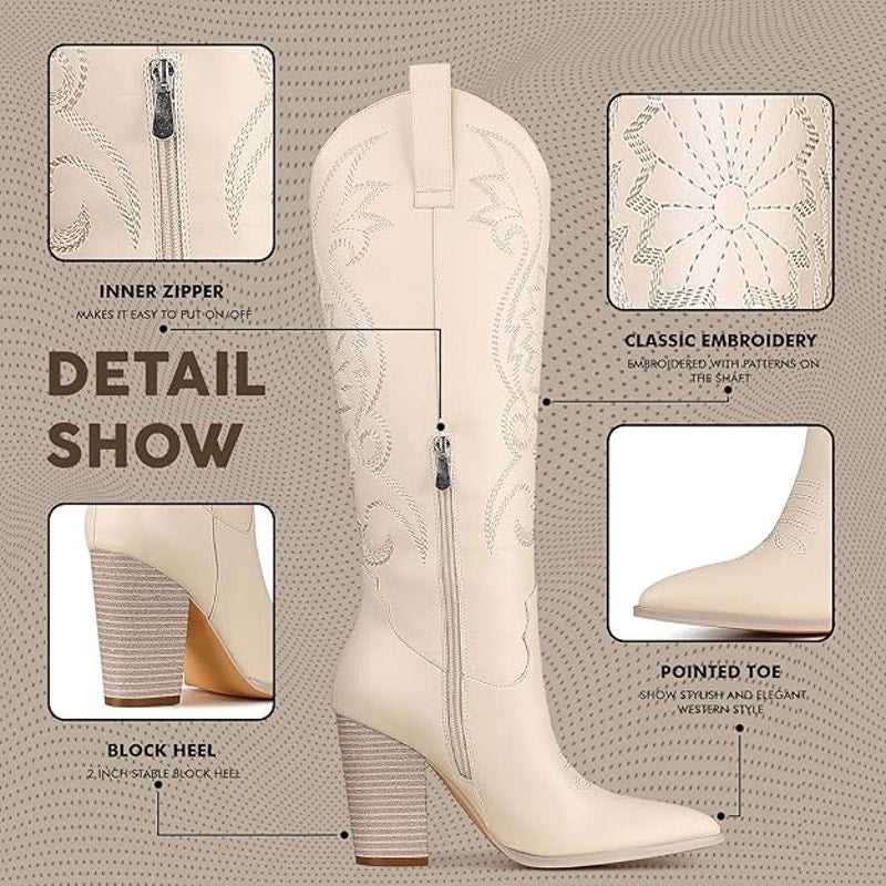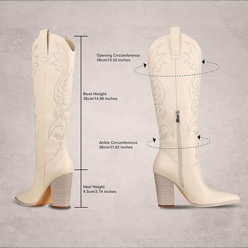 Vomira Womens Size 10 Cream Embroidered Knee High 4" Heel Cowboy Boot Shoes