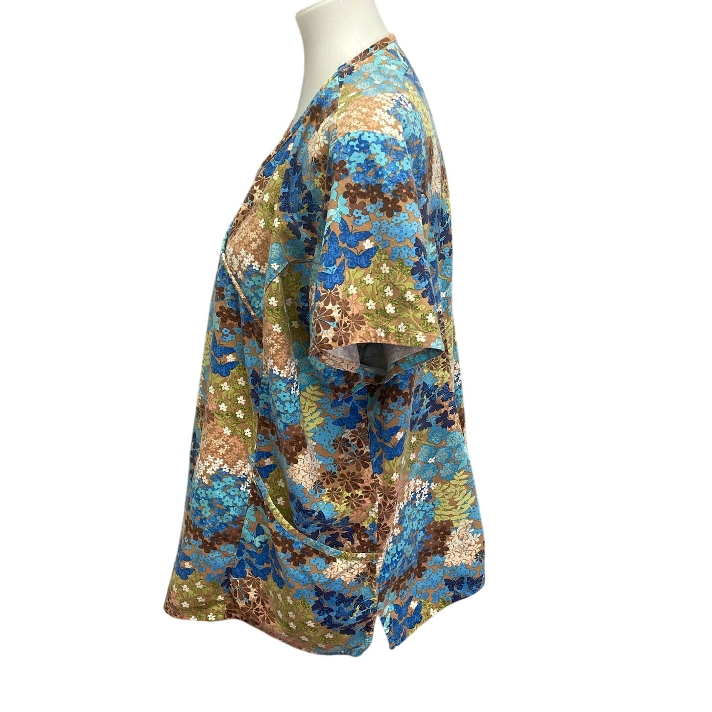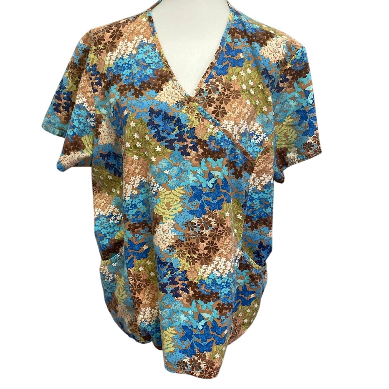 Womens 2X Butterflies Flowers Floral Short Sleeve Cotton Blend Scrub Top Pockets