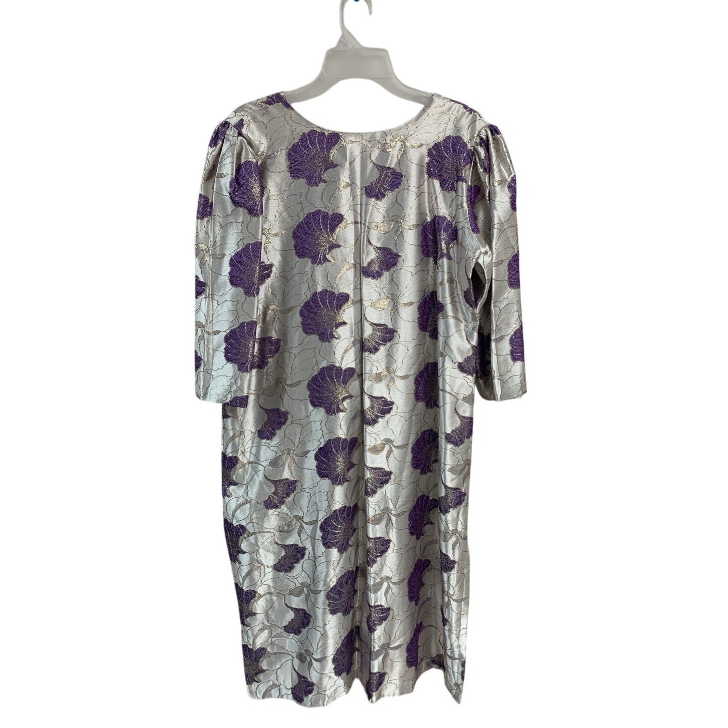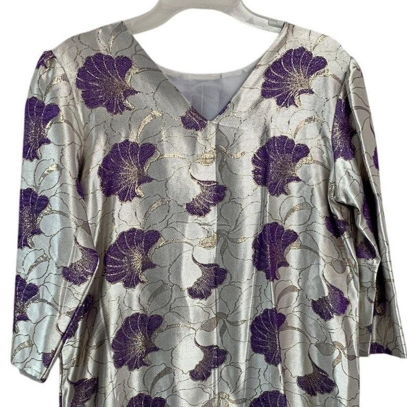 Womens XXL Silver Metallic Purple Floral Long Sleeve V Neck Midi Shift Dress