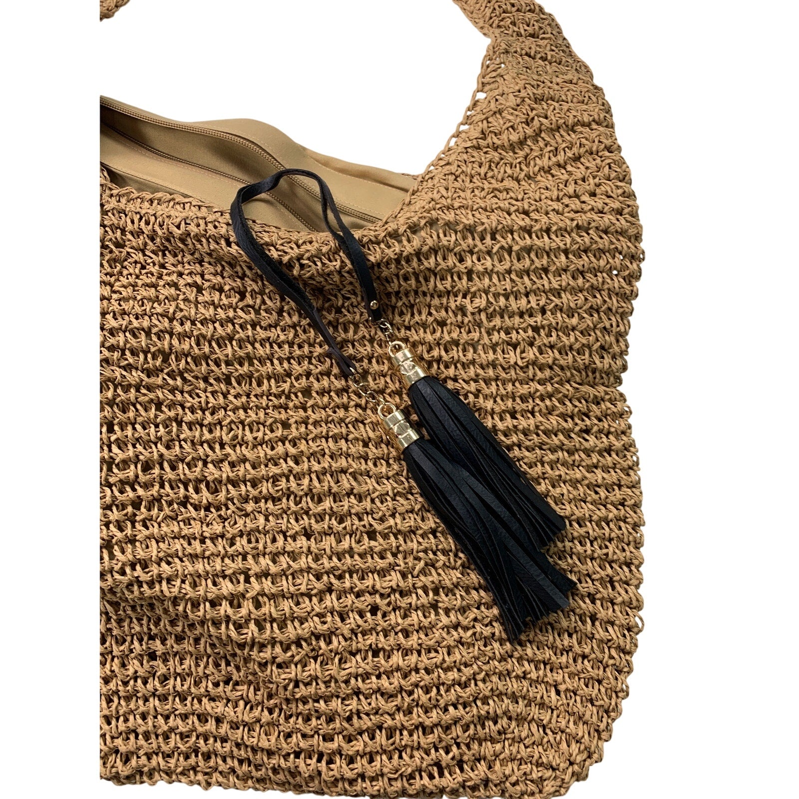 Woven Large Boho Rattan Straw Tote Lined Beach Shoulder Bag w Black Tassels